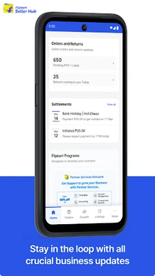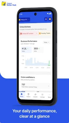 Ukiwa na Flipkart Seller Hub, mchakato wa kujiunga ni rahisi ajabu na huchukua dakika chache tu. Baada ya kusajiliwa, utapata dashibodi jumuishi inayokuwezesha kufuatilia kila kitu – kuanzia kuorodhesha bidhaa zako kwa urahisi, kufuatilia mauzo kwa wakati halisi, hadi kusimamia maagizo mapya. Programu hii hukupa udhibiti kamili wa shughuli zako za kibiashara: kubali maagizo, anzisha usafirishaji, fuatilia bidhaa zinazotumwa, na upokee malipo yote kutoka kiganja cha mkono wako. Usimamizi wa hesabu ya bidhaa na ufuatiliaji wa utendaji wa biashara yako pia umefanywa kuwa rahisi, kukusaidia kuepuka upungufu wa bidhaa na kuboresha tija.