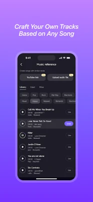 Anzisha safari yako ya muziki bila kikwazo chochote ukitumia Mureka. Hiki ndicho chombo chako cha mwisho cha kuunda nyimbo za kuvutia na melodi zinazovutia, hata kama huna ujuzi wa muziki. Chagua kwa urahisi sauti inayokuvutia – bainisha jinsia ya mwimbaji na sauti unayoipenda ili kuipa nyimbo zako uhai halisi. Badilisha muziki wako upendavyo kwa kuchagua mitindo, hisia, na vyombo mbalimbali, ukihakikisha kila wimbo unalingana na ladha yako ya kipekee. Mureka inarahisisha uundaji wa sanaa ya muziki, ikikuwezesha kuunda nyimbo kamili kwa urahisi usio na kifani.